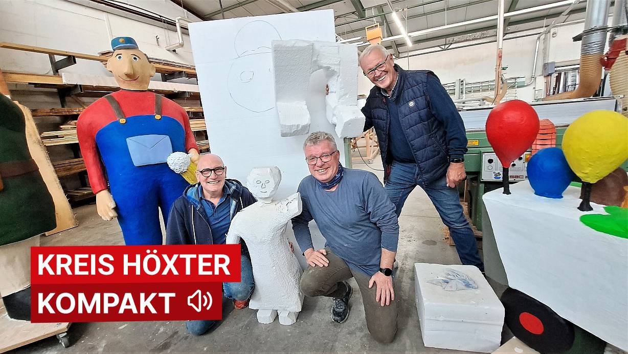 Ohne Spaß geht's nicht: Frank Janßen (v. l.), Matthias Walbaum und Klaus Ovenhausen haben mit einem ganzen Team voller kreativer Jecken eine ganz spezielle Deko für Steinheims Verkehrsinsel in der Hospitalstraße geschaffen. | © Neue Westfälische