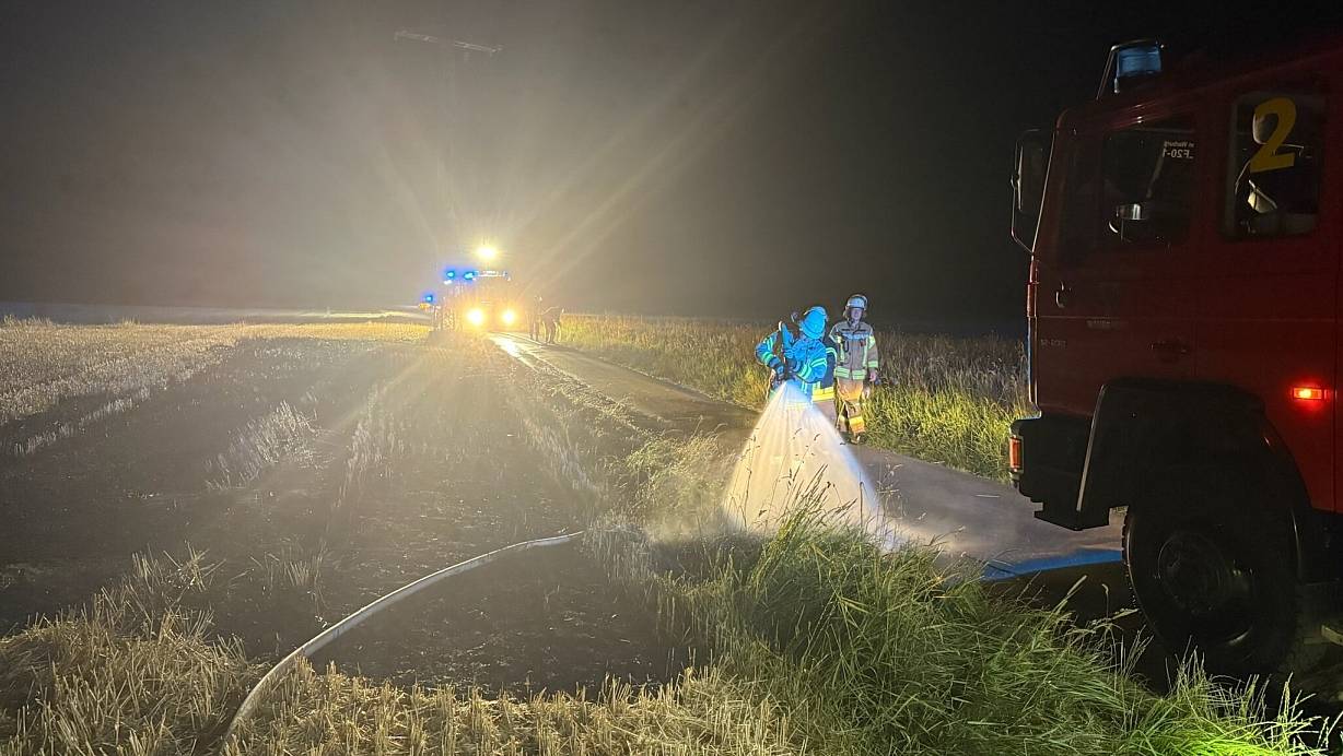 Warburg-Ossendorf. Die Strategie der Feuerwehr ist dabei: die weitere Ausbreitung verhindern und auf das, was glimmt, viel Wasser drauf. Einfach gesagt. So auch geschehen beim nächtlichen Feuer auf einem Stoppelfeld nahe Ossendorf in der Nacht zu Sonntag.