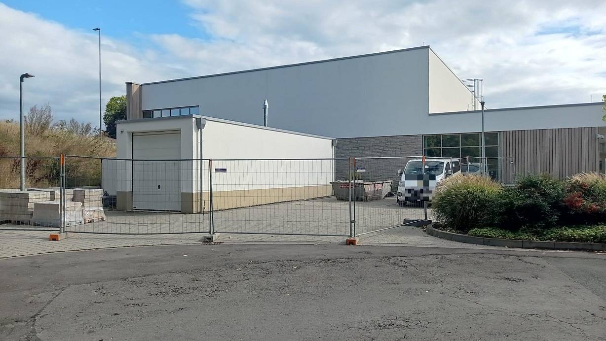 Der Hintereingang des Hallenbades ist mit Bauzaun abgesperrt, davor stehen ein Handwerkerwagen und Paletten mit Fliesen. | © Michaela Bast