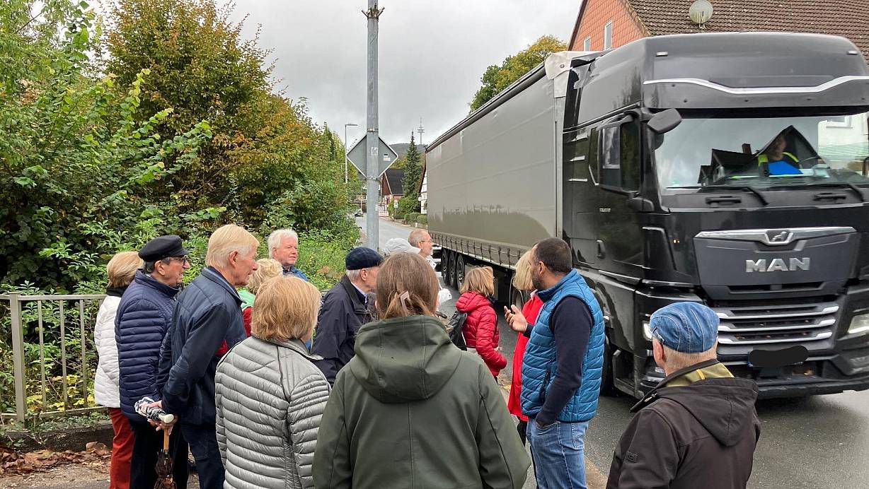 Mitglieder der Senioren-Union hören den Ausführungen von Edison Buch (2. v. r.) über die Problematik des Schwerlastverkehrs auf der Straße Bödexer Tal zu. | © Senioren-Union