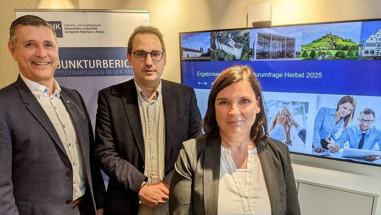 IHK-Leiter Jürgen Behlke, Vollversammlungsmitglied Gerrit Becker und die stellvertretende IHK-Geschäftsführerin Claudia Auinger präsentieren die Herbst-Konjunkturumfrage. | © Burkhard Battran