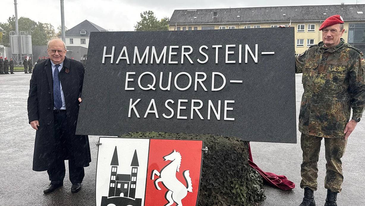 Christoph Freiherr von Hammerstein Gesmold und Kommandeur Michael Lutz haben das neue Namensschild der Kaserne enthüllt. Es soll in den nächsten Tagen angebracht werden. | © Ralf T. Mischer