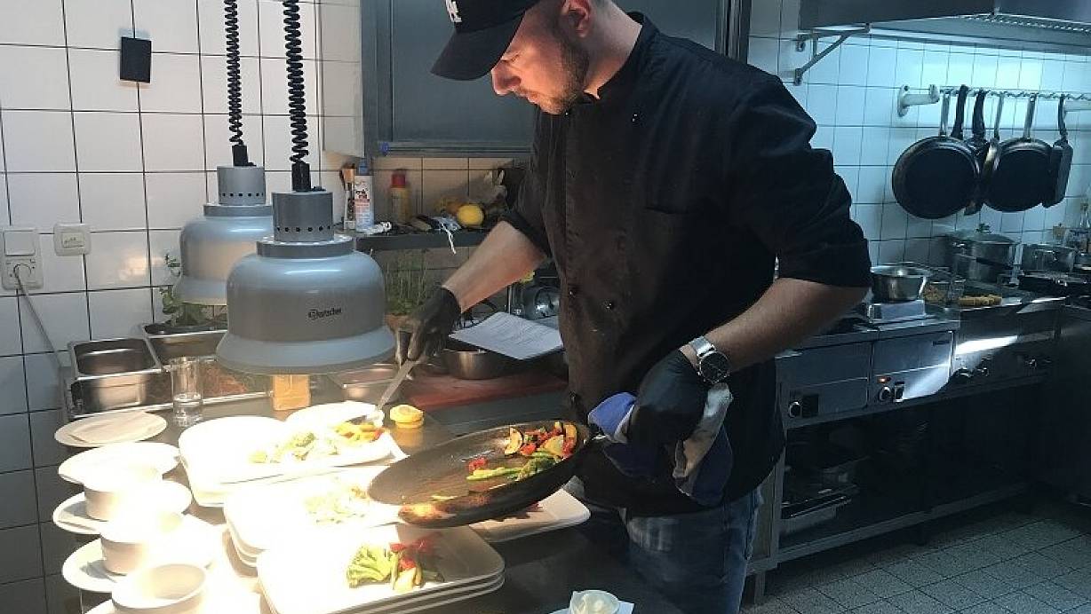 Manuel Hoffmann richtet Speisen in der Küche des Restaurants Höxter Am Jakobsberg in Ovenhausen her. | © Restaurant Höxter Am Jakobsberg