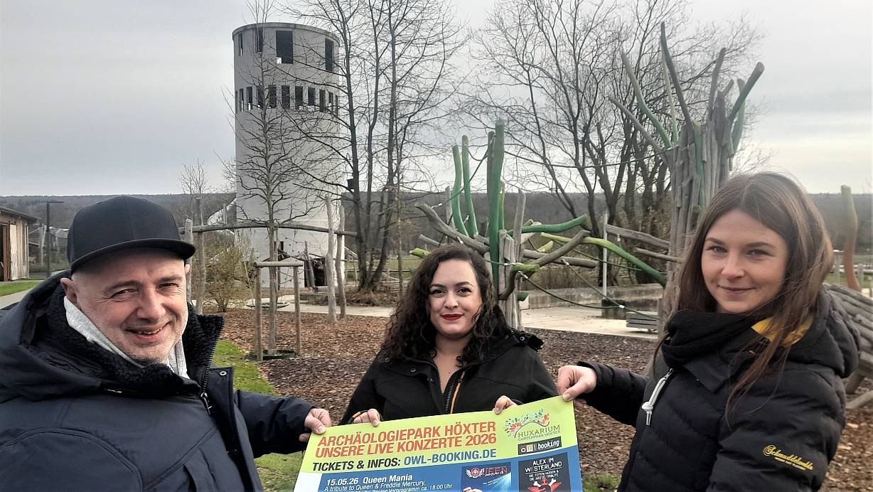 Stefan Friedrich von OWL Booking (v. l.), Gizem Cevik vom Bunten Klassenzimmer und Huxarium-Geschäftsführerin Madita Alberding freuen sich auf die neue Saison 2026 im und rund um den Archäologiepark. | © Simone Flörke
