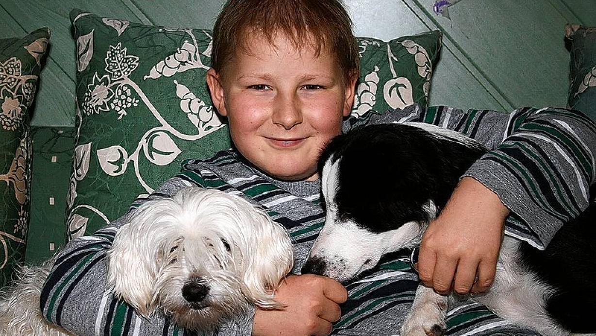 Der zehnjährige Moritz Saage mit Teletubbie-Hund Sammy (l.) und Bordercollie-Hündin Amy meistert seinen Alltag. | © FOTO: MANUELA SCHÜRSTEDT