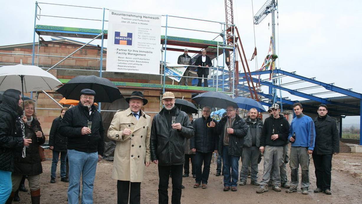 Die ACS-Geschäftsführer Dr. Horst Finkelmeier (vorne r.) und Michel Specklin (vorne 2. v. r.) stoßen mit den Gästen an. Zuvor zelebrierten Zimmerermeister Karl-Heinz Kiel und Maurermeister Markus Meyer auf dem Gerüst das Richtfestritual. | © FOTO:TORSTEN WEGENER