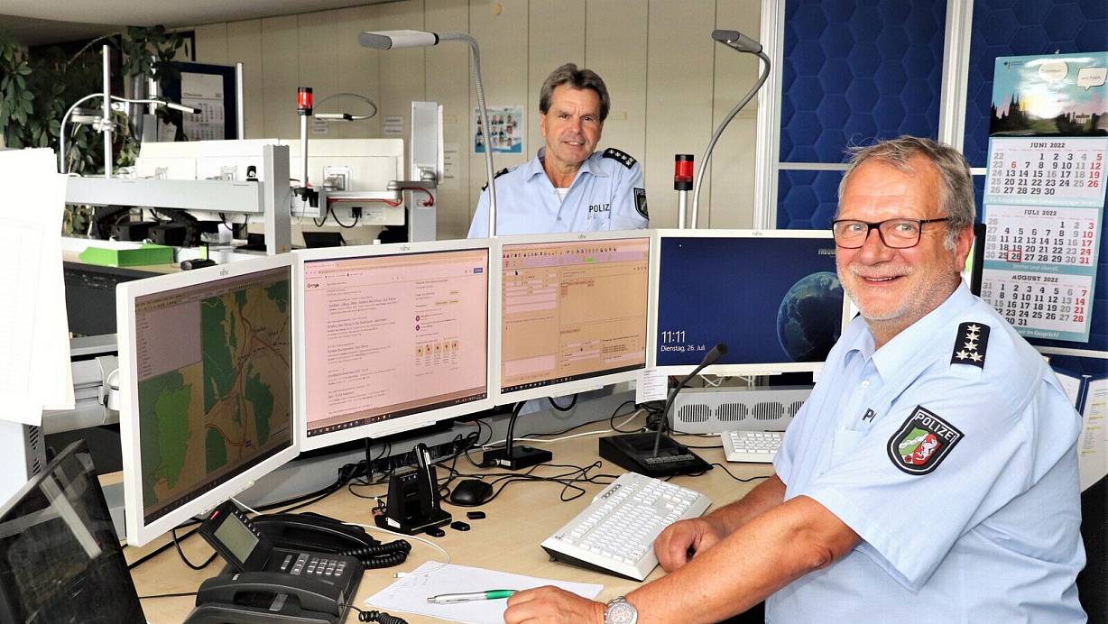 In der Leitstelle der Polizei Höxter gehen die Notrufe aus dem gesamten Kreisgebiet ein: Uwe Scherding, Erster Polizeihauptkommissar (l.), Leiter der Leitstelle, und Johannes Thonemann, Erster Polizeihauptkommissar, Dienstgruppenleiter Leitstelle. | © Polizei Höxter