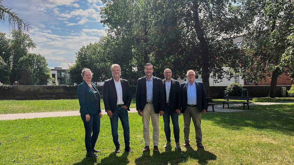 Swantje Penke (Studiendekanin Soziale Arbeit an der Fakultät Management, Soziale Arbeit, Bauen der HAWK Standort Holzminden, v. l.), Marc Hudy (Präsident der HAWK), Christian Belke (Bürgermeister der Stadt Holzminden), Jens-Martin Wolff (Stadtoberbaurat und Leitung Bauen und Stadtentwicklung der Stadt Holzminden) und Matthias Seeliger (Leitung Stadtarchiv der Stadt Holzminden) zeigen, wo das neue HAWK-Gebäude stehen soll - mitten im Grünen. | © HAWK