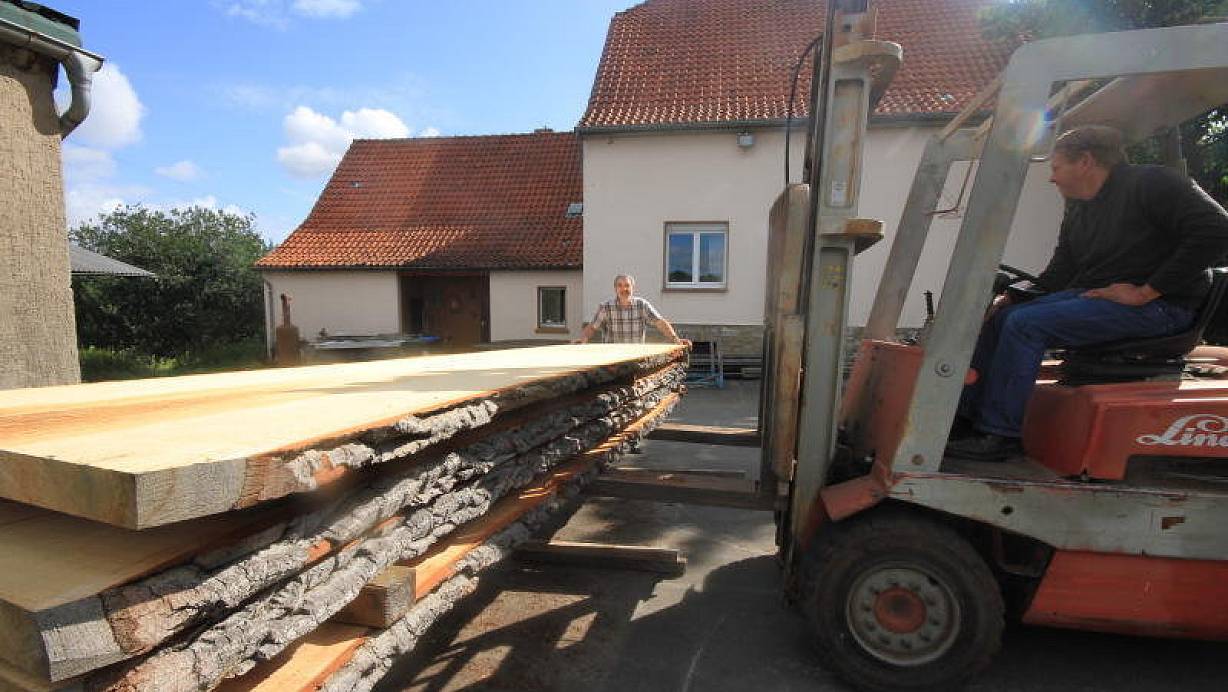 Lange Bretter: Die Eiche, die einst beim Gut Breitenhaupt stand, ist nun im Sägewerk bei Billerbeck in Holzscheiben geteilt worden. | © Madita Schellenberg