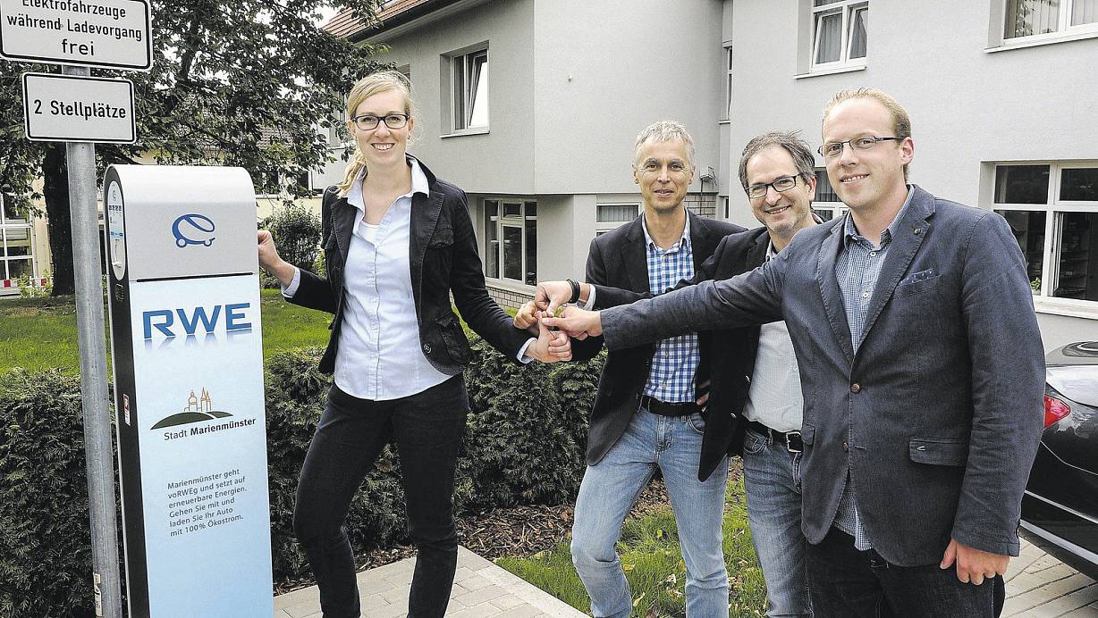 Strom für Autos: "Wir halten Marienmünster unter Spannung", deuten Saskia Kemner (v. l.), Josef Suermann, Matthias Peitsch und Stefan Niemann an. | © Josef Köhne
