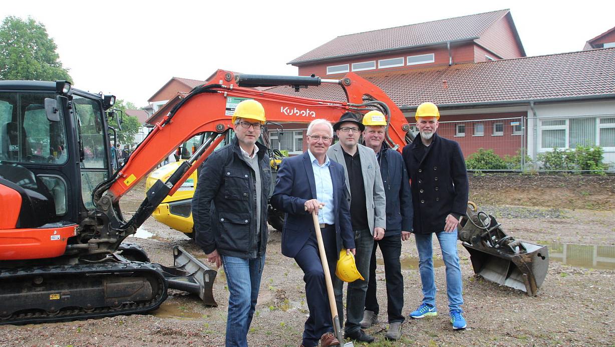 Offizieller Baubeginn: Fachbereichsleiter Matthias Peitsch (v. l.), Bürgermeister Robert Klocke, Architekt Christian Sauer, Bauunternehmer Rudolf Büker und Schulleiter Nicolay Loges. | © Burkhard Battran