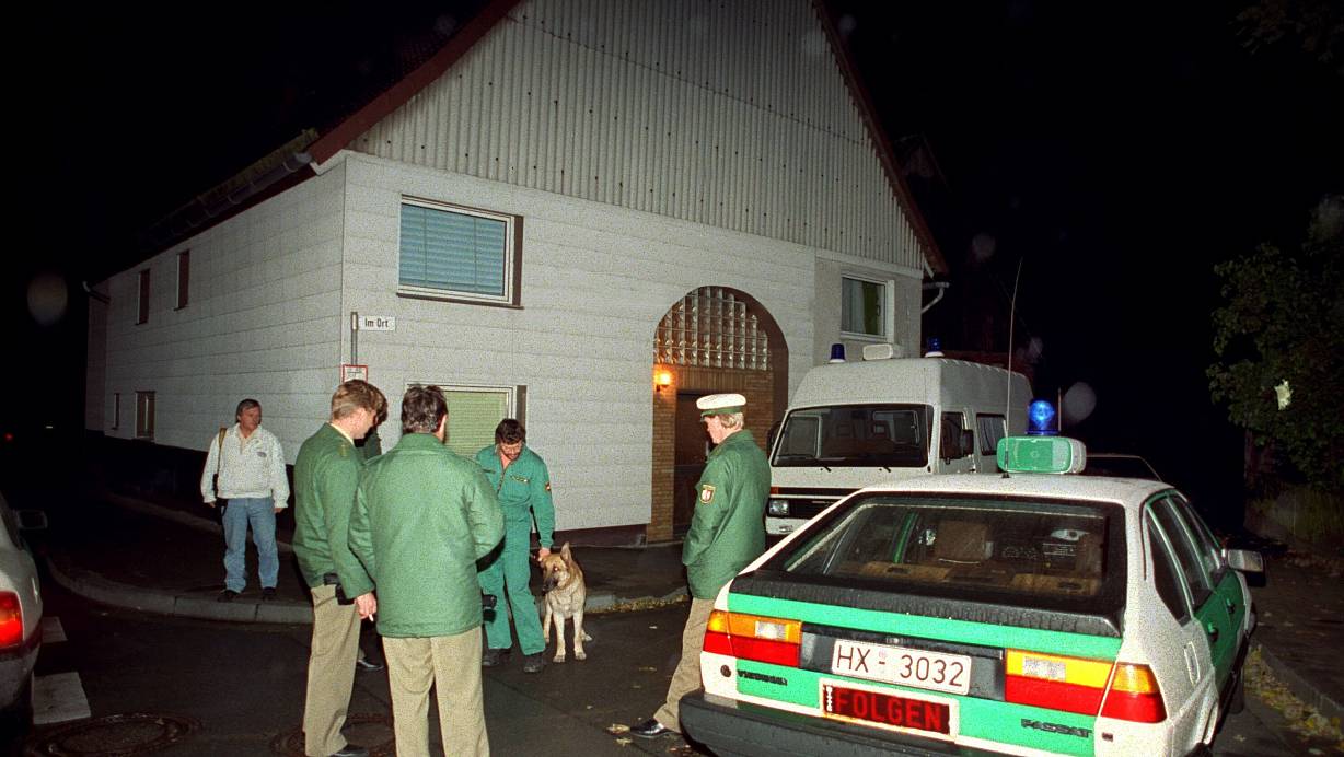 Polizisten und ein Einsatzfahrzeug stehen am 17.10.1991 in Bredenborn im Kreis Höxter vor dem Haus, in dem drei Brüder als mutmaßliche Mörder der Polizisten Andreas Wilkending und Jörg Lorkowski festgenommen wurden. | © dpa/holger hollemann
