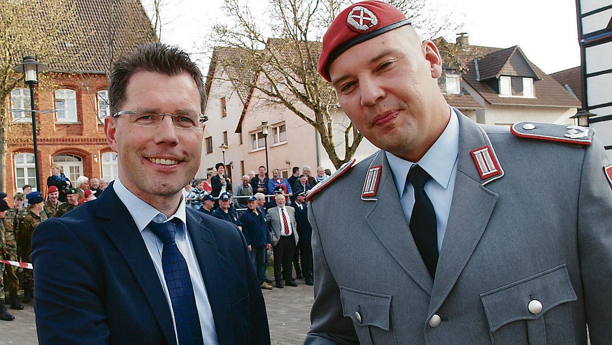 Abschied: Mit einem kräftigen Händedruck sowie guten Wünschen für die Soldaten und die Bürger der Stadt Nieheim beendeten Bürgermeister Rainer Vidal (l.) und Major Jan Lehmann die Patenschaft. | © FOTOS: JOSEF KÖHNE