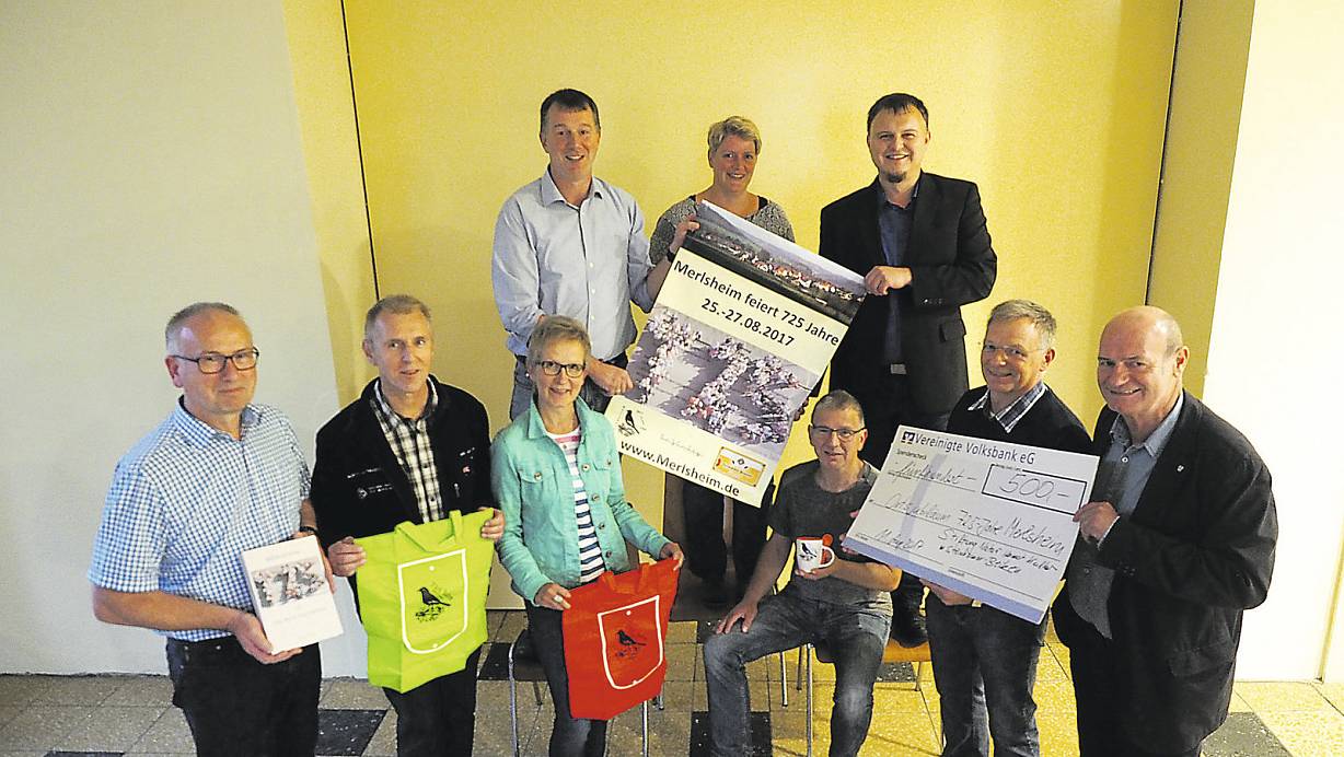 Gut aufgestellt: Das Foto zeigt acht Mitglieder des zwölfköpfigen Festkomitees mit Gisbert Zünkler (v. l.), Gerhard Horstmann, Annette Zünkler, Christof Kros, Tanja Rolf-Thiet, Thomas Riedel, Swen Horstmann und Herbert Müller sowie mit Sponsor Willi Stecker. | © Josef Köhne