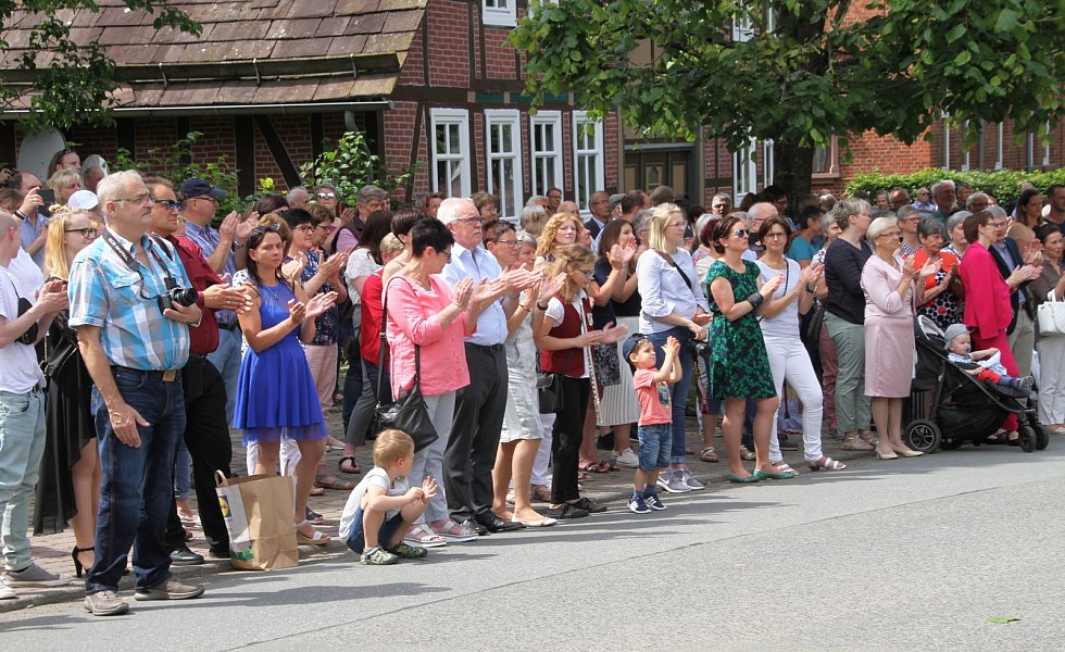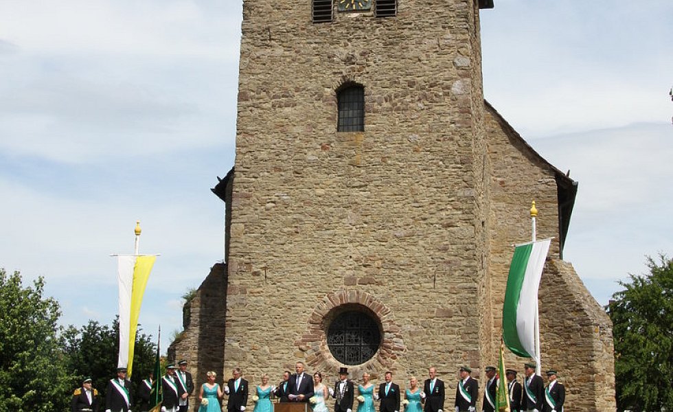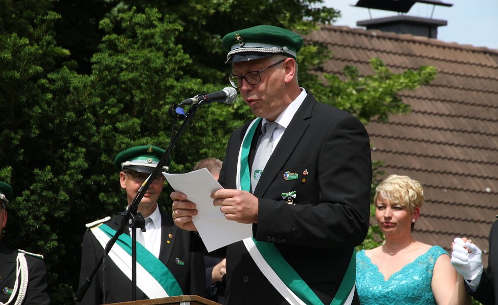Neben den Majestäten stellte Vereinsvorsitzender Michael Dubbert in diesem Jahr aber noch eine andere Gruppe in den Mittelpunkt seiner Ansprache zum großen Festakt vor der Kirche. Er erinnerte an den Großbrand in der Ortschaft Anfang April, bei dem die Mitglieder der Freiwilligen Feuerwehr "durch ihren schnellen und professionellen Einsatz" ein Übergreifen der Flammen auf weitere Wohnhäuser im eng bebauten Ortskern verhindert hatten. "Es ist schön, dass es Euch gibt", sagte Michael Dubbert unter dem großen Beifall des Publikums.