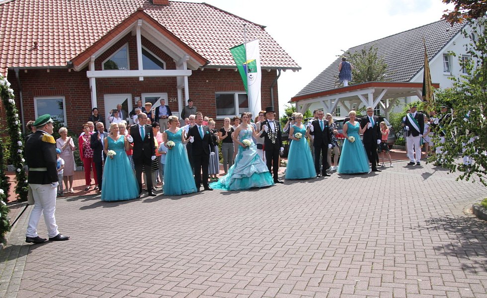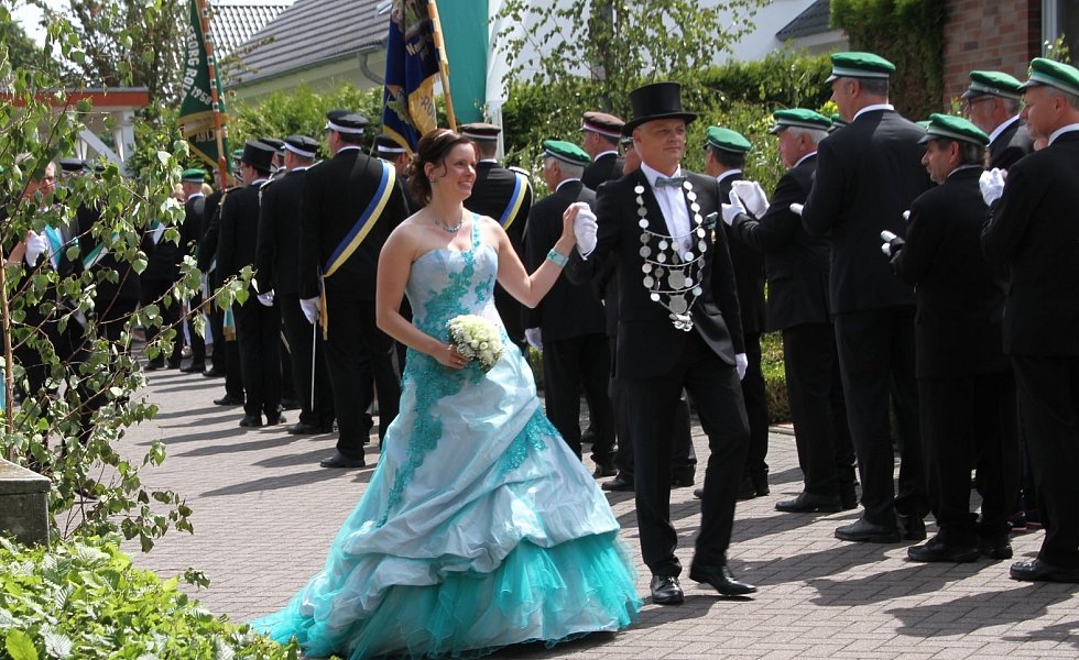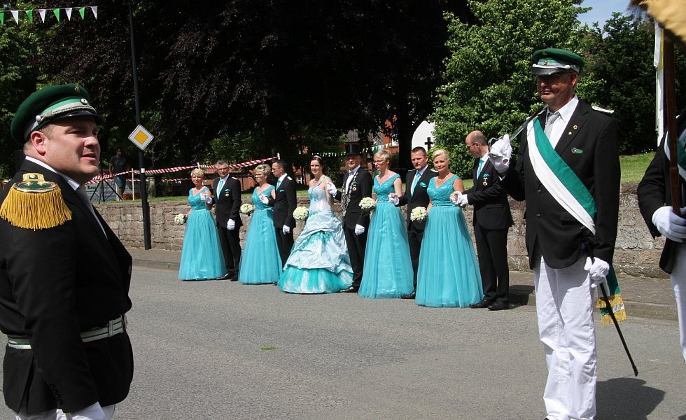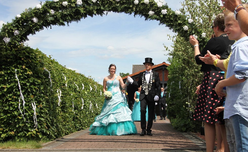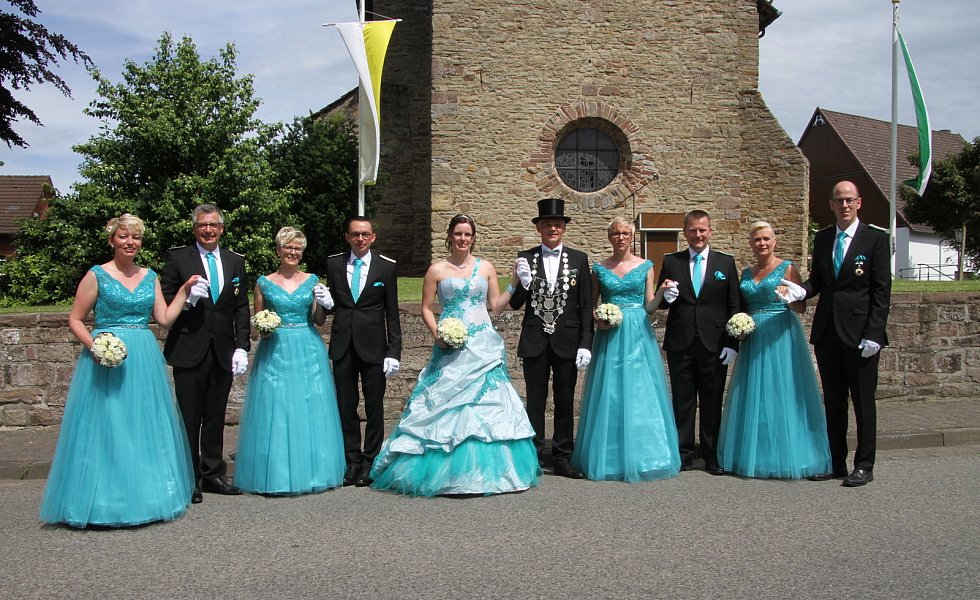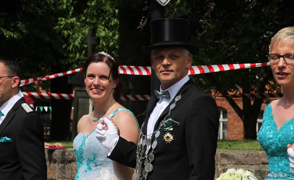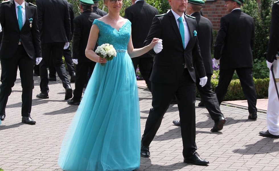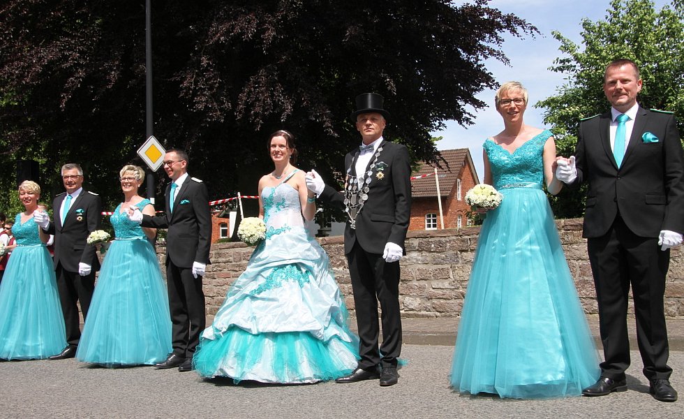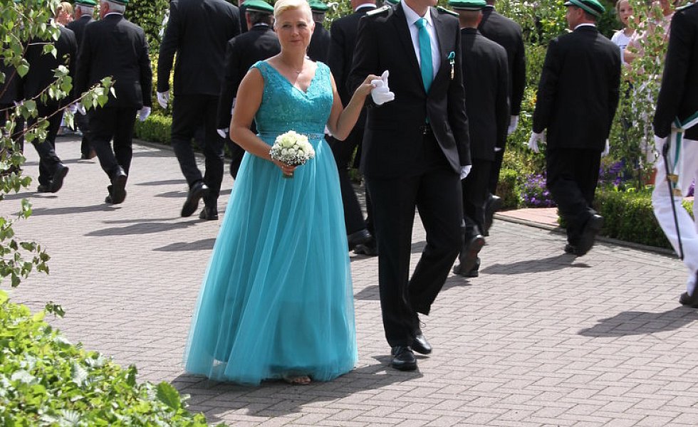 Die vor allem beim weiblichen Publikum mit Spannung erwartete Präsentation des Königinnenkleides mündete in großen Jubel. Katharina Müller zeigte sich in einem weiß-türkisfarbenen Kleid, perfekt abgestimmt auf die ebenfalls in Türkis gekleideten Damen des Hofstaates. Der bestand in diesem Jahr mit Uwe und Vera Müller, Marc und Bianka Dreier, Christoph und Alexandra Sommer sowie Patrick und Barbara Böddeker gleich aus vier Paaren - ein Novum in der über 400-jährigen Sommerseller Schützenfesttradition, wie der Vorsitzende des Heimatschutzvereins Sommersell, Michael Dubbert, in seiner Rede ausdrücklich hervorhob. Zugleich betonte er die Verbundenheit der Majestäten und des Hofstaates mit dem Schützenwesen. So waren beispielsweise Uwe Müller und Marc Dreier bereits 2009 beziehungsweise 2013 selbst die Regenten in Sommersell.