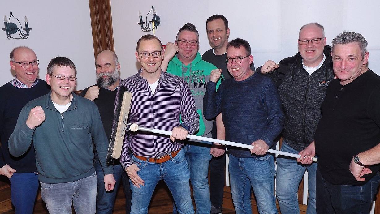 „Wenn es am Rosenmontag nicht klappen sollte, fressen wir einen Besen mit Stiel“, versprach das Wagenbauerressort mit (v. l.) Bernhard Schröder, Dirk Fröhling, Frank Fröhling, Thomas Filter, Stefan Schlick, Frank Filter, Elmar Lohre, Frank Bertram und Michael Nestler. | © Josef Köhne