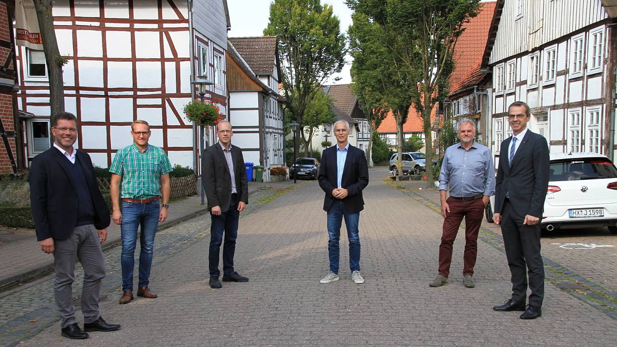 Nieheims Bürgermeister Rainer Vidal (v. l.), Florian Greger (Stadt Nieheim), Stefan Niemann (Stadt Marienmünster), Josef Suermann (allgemeiner Vertreter des Bürgermeisters in Marienmünster), Michael Fißmer (Stadt Vlotho) und Schieder-Schwalenbergs Bürgermeister Jörg Bierwirth haben die Bewerbung auf den Weg gebracht. | © Madita Schellenberg