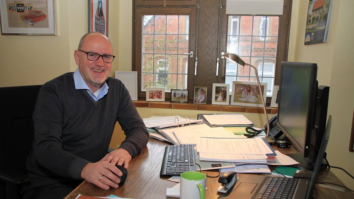 Johannes Schlütz, Bürgermeister der Stadt Nieheim, an seinem Schreibtisch im Rathaus. Auf dem Fensterbrett hat er einige Familienfotos aufgestellt. | © David Schellenberg