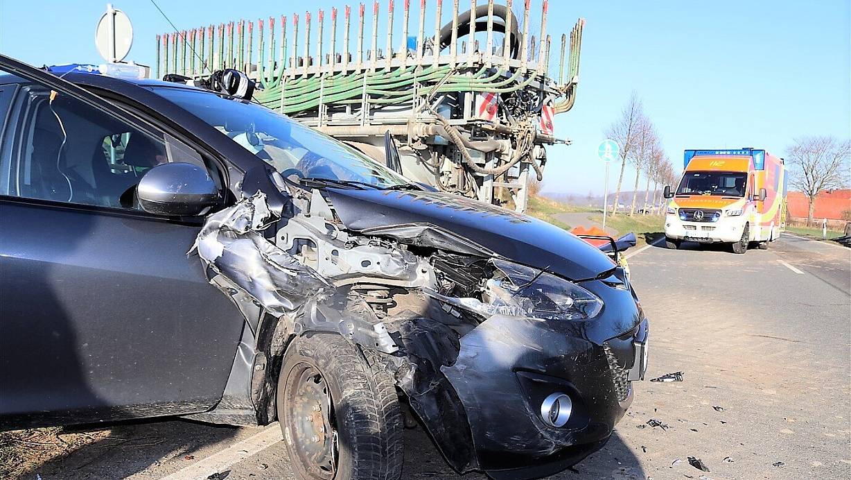 Zwischen Nieheim und Marienmünster stieß eine Autofahrerin mit einem Gülletrecker zusammen. | © Polizei Höxter