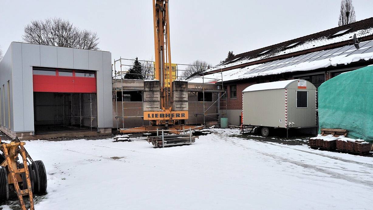 Das Rolltor ist schon drin: Der Rohbau des Feuerwehrhausen am Sport- und Vereinsheim in Entrup steht. | © Josef Köhne