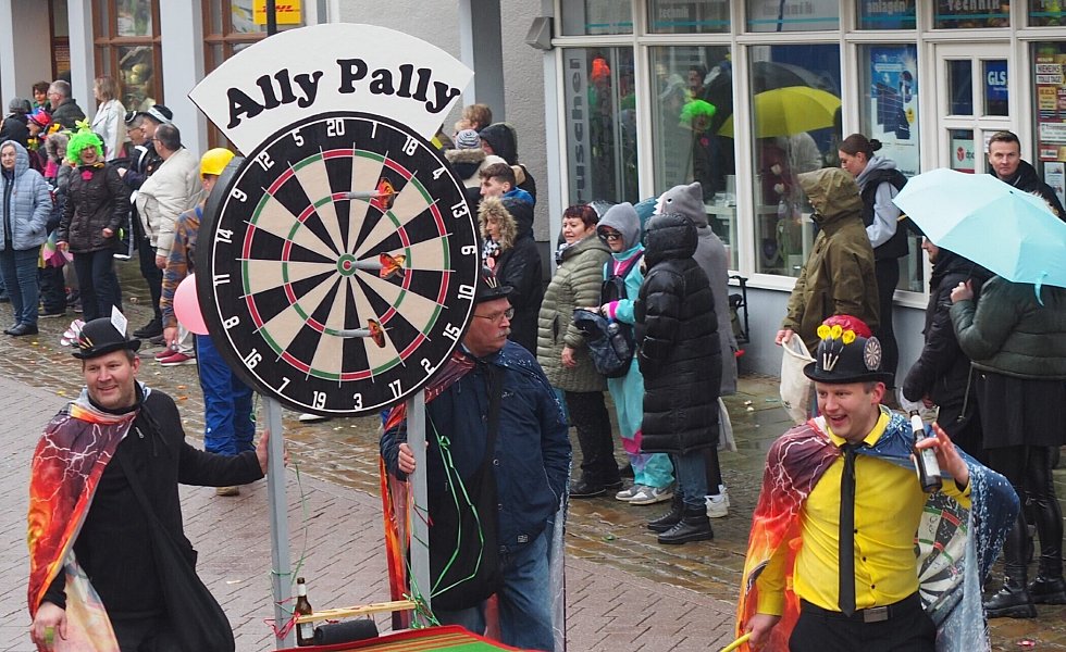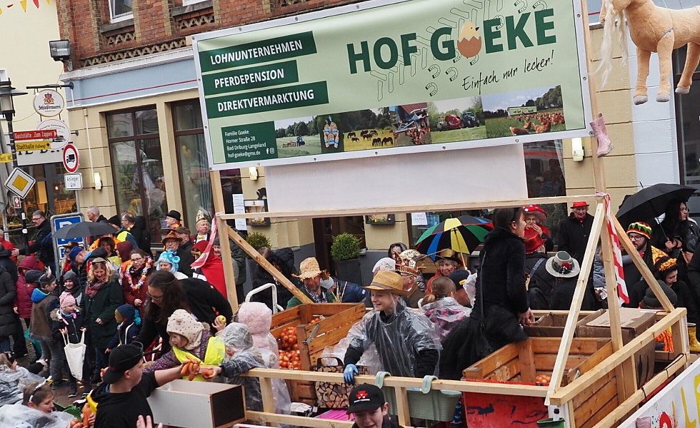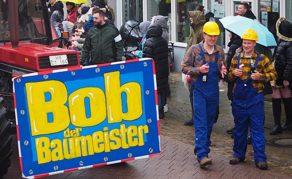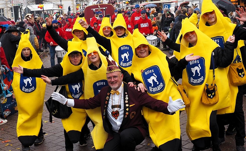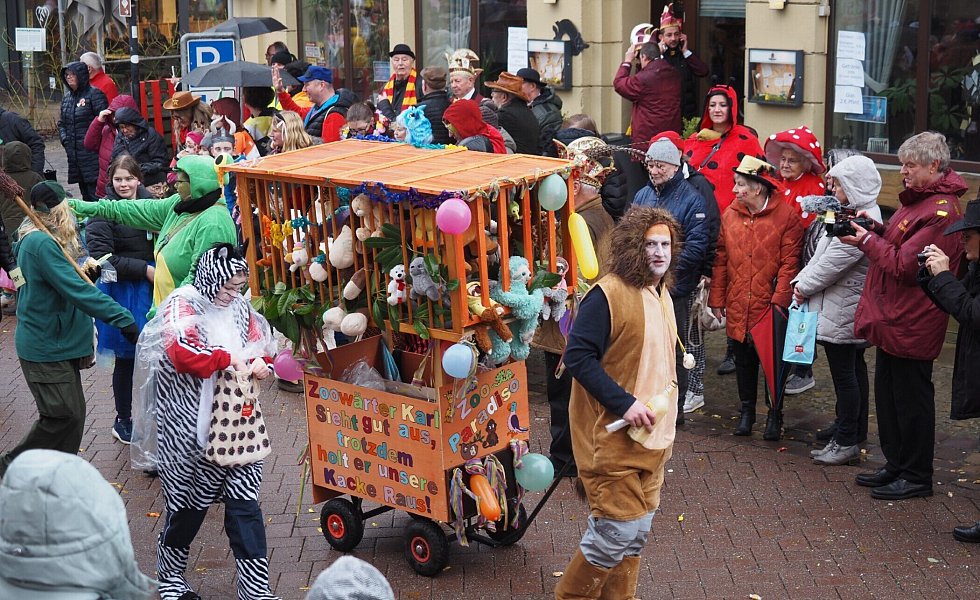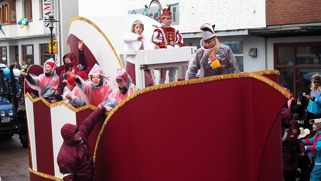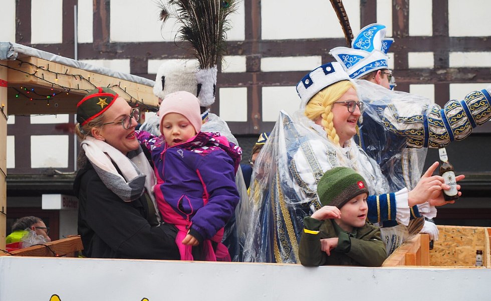 Zentnerweise flogen Bonbons, Bananen, Vitamine und Zwiebeln unters Volk und ließen die Taschen der fleißig Sammelnden rasch voll werden. Für anerkennende Begeisterung sorgten die Themenwagen von Bauerndiesel, Malle-Tourismus, Bob dem Baumeister, die „New Kids“ oder die Ampel-Kritiker. Die Show stahl in diesem Jahr aber bei allen fahrenden Narren der neue Kinderprinzenwagen, der in Form einer Narrenkappe durch den historischen Stadtkern rollte.