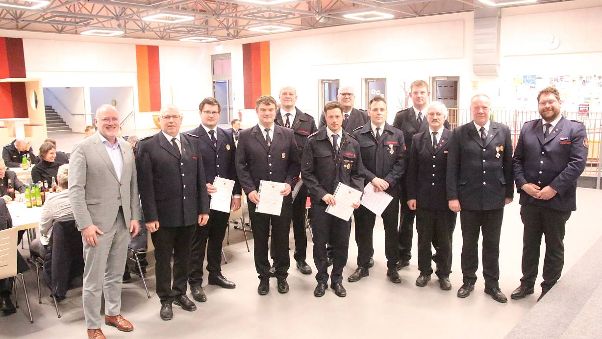 Bürgermeister Johannes Schlütz (v. l.) und Wehrführer Ulrich Engelke gratulieren den besonders geehrten und neuverpflichteten Einheitenführern. | © Burkhard Battran