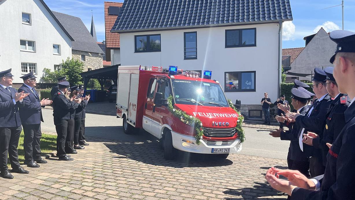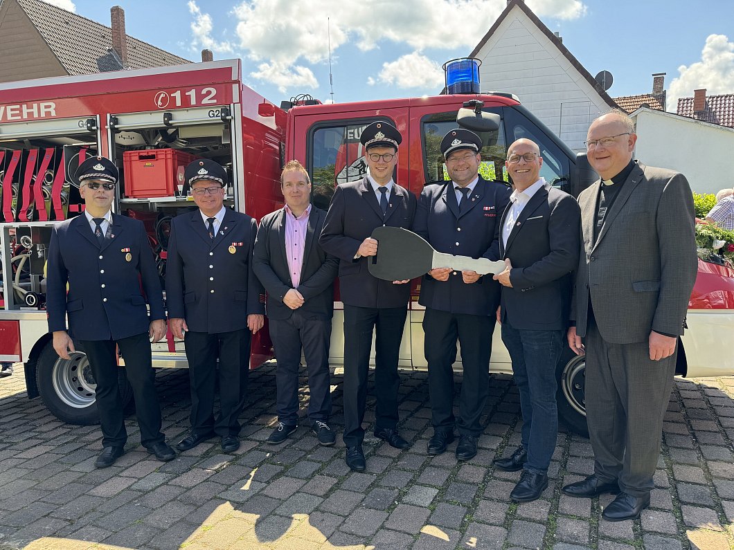 Alle Kameradinnen und Kameraden der Löschgruppe standen Spalier. Nach den Grußworten der Ehrengäste segnete Pastor Bischof das Fahrzeug. Anschließend wurde der symbolische Schlüssel von der Stadt Nieheim an die Wehrführung übergeben und an den Löschgruppenführer weitergereicht.