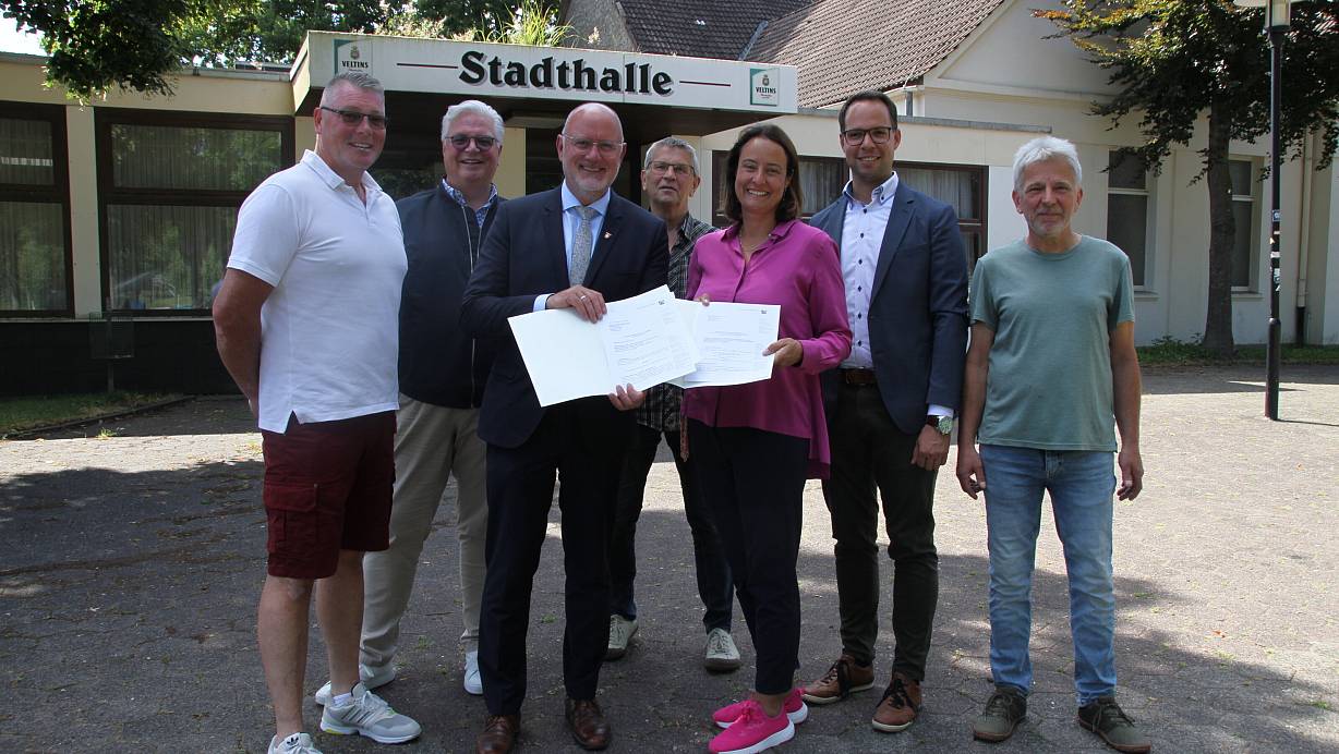 Guido Karp (UWG, v. l.), Elmar Kleine (CDU), Bürgermeister Johannes Schlütz, Wolfgang Kuckuck (SPD), Regierungspräsidentin Anna Katharina Bölling, Bauamtsleiter Manuel Bröker und Thomas Riedel (Grüne) freuen sich über die beiden Förderbescheide. | © Madita Schellenberg
