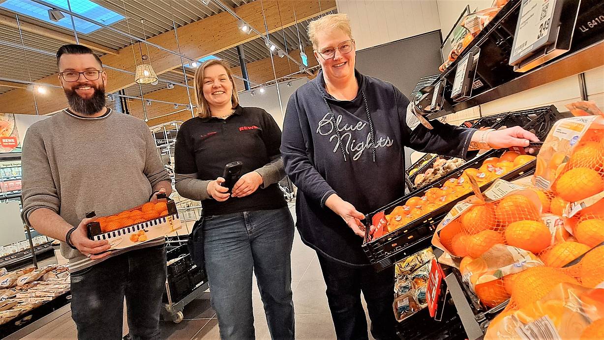 Alle packen beim Einräumen im neuen Rewe in Nieheim mit an: Marktleiter Sebastian Stein, Anna-Lena Stöver und Melanie Quittek. | © Madita Schellenberg