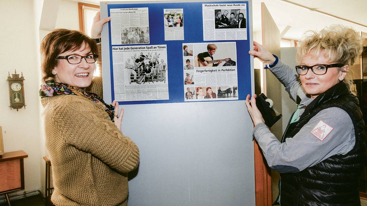 Engagiert: Karin Obermann (l.) und Teresa Ligendza helfen bei der Organisation der Ausstellung zur 40-jährigen Geschichte der Musikschule. Mühevoll haben sie viele Zeitungsartikel und Fotos von Konzerten und Feiern aus bunte Plakate geklebt. Interessierte können sich die Ausstellung ab Sonntagnachmittag anschauen. | © Fotos: Madita Peine