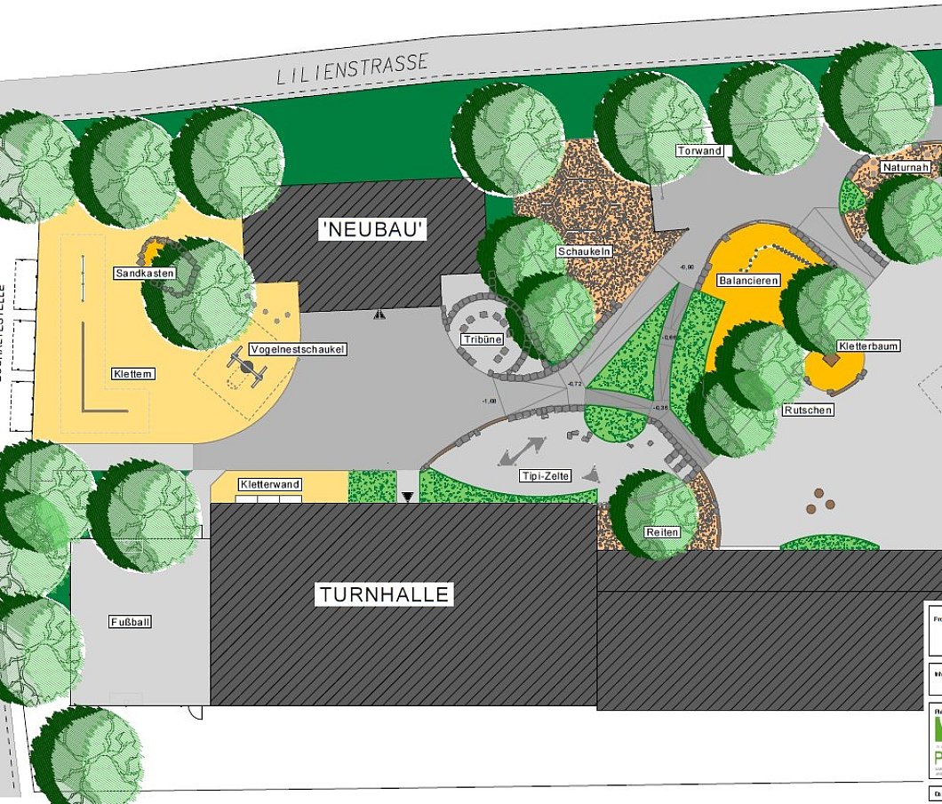 Neu gestaltet werden soll auch der Außenbereich der Grundschule. Besonders wichtig: eine neue Rampe für Rollstuhlfahrer zwischen dem niedriger und dem höher gelegenen Areal. Neben Schaukeln, Rutschen, Balanciergeräten, Torwand und Sandkasten plant die Landschaftsarchitektin auch den Bau von Tipi-Zelten sowie eines „Grünen Klassenzimmers". Auch ein Fußballfeld wäre möglich. Insgesamt soll der Schulhof naturnah gestaltet werden und viele Möglichkeiten zum Bewegen und Versteckspielen bieten.