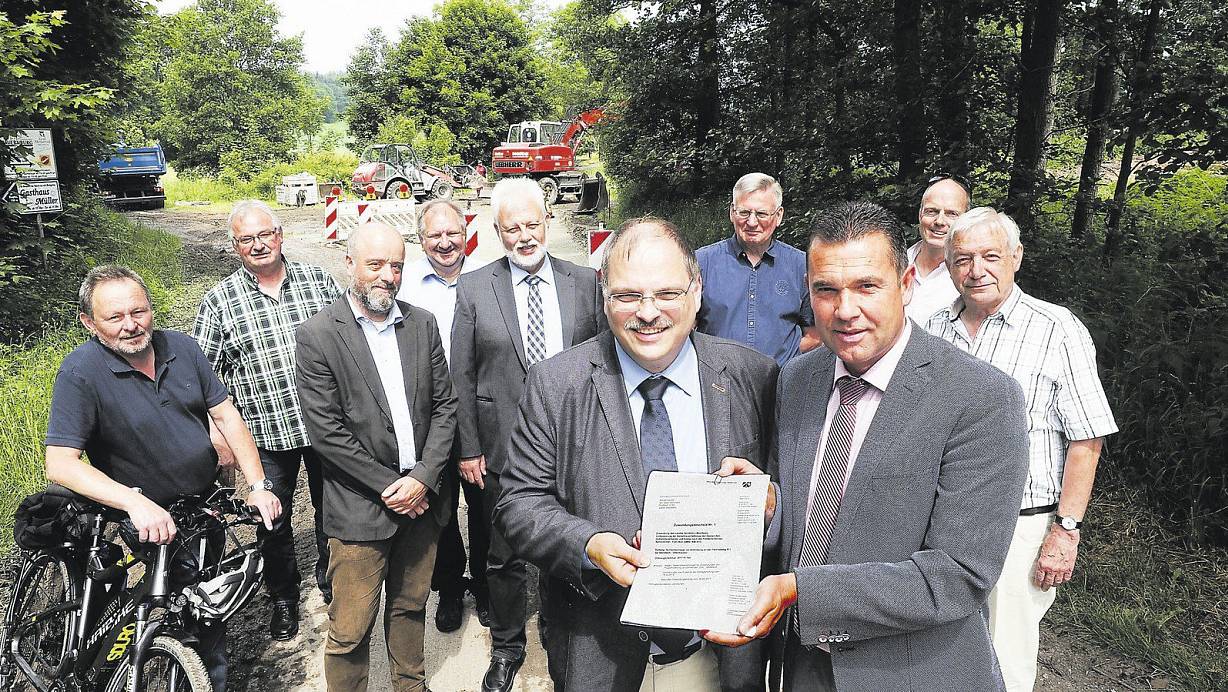 Neuer Radweg: Den Förderbescheid übergab Peter London (vorne l.) an Bürgermeister Carsten Torke. Die Aufsicht- und Ausführenden sind (v. l.) Albert Schnurrbusch, Alfons Bödeker, Christian Glasl, Heribert Gensicki, Uwe Rafflenbeul, Wolfgang Diekmann, Ralf Kleine und Karl-Heinz Huneke. | © Josef Köhne