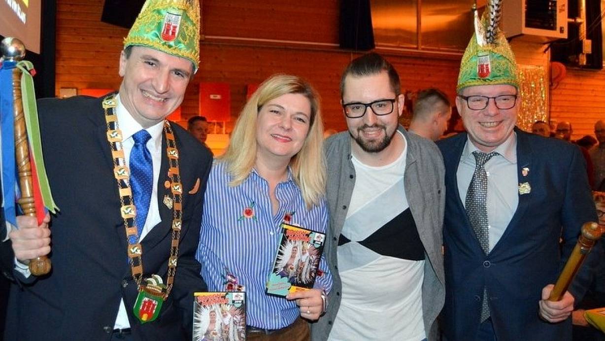 Danken ab: Das scheidende Prinzenpaar Thomas Fichter (v. l) und Prinzessin Kirsten Volmer, Filmemacher Kevin Klaes und Hofmarschall Matthias Walbaum. | © Stefan Wiedemeier