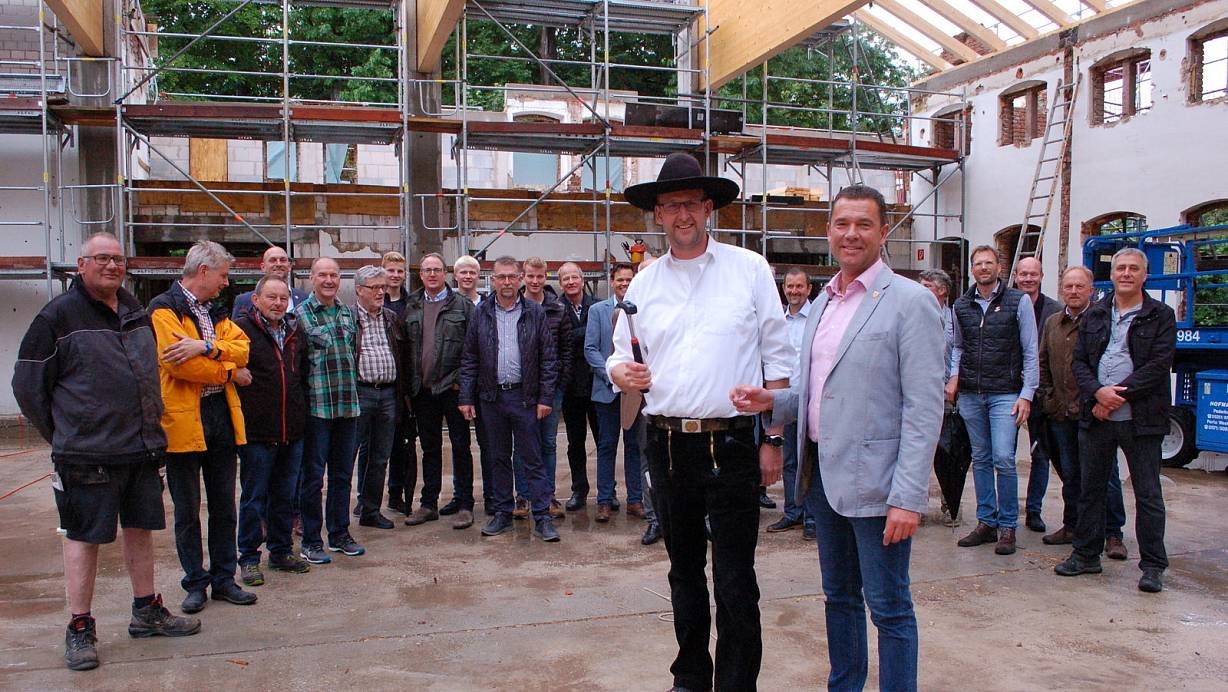 Steinheim. Die Halle ist komplett entkernt, das Dach ist gerichtet. Am Mittwoch wurde an der Steinheimer Stadthalle Richtfest gefeiert. Bürgermeister Carsten Torke freute sich, dass man mit den Bauarbeiten „ganz gut in der Zeit" liege, obwohl bei einem Gebäude, das in die Jahre gekommen sei, „immer mal wieder das ein oder andere U-Boot auftaucht". Auf einen Zeitpunkt der Fertigstellung wollte er sich deshalb auch nicht festlegen. „Auf jeden Fall aber im nächsten Jahr", sagte er vor den Bauarbeitern, Vereinsvertretern und Ratsmitgliedern, die zum Richtfest gekommen waren.