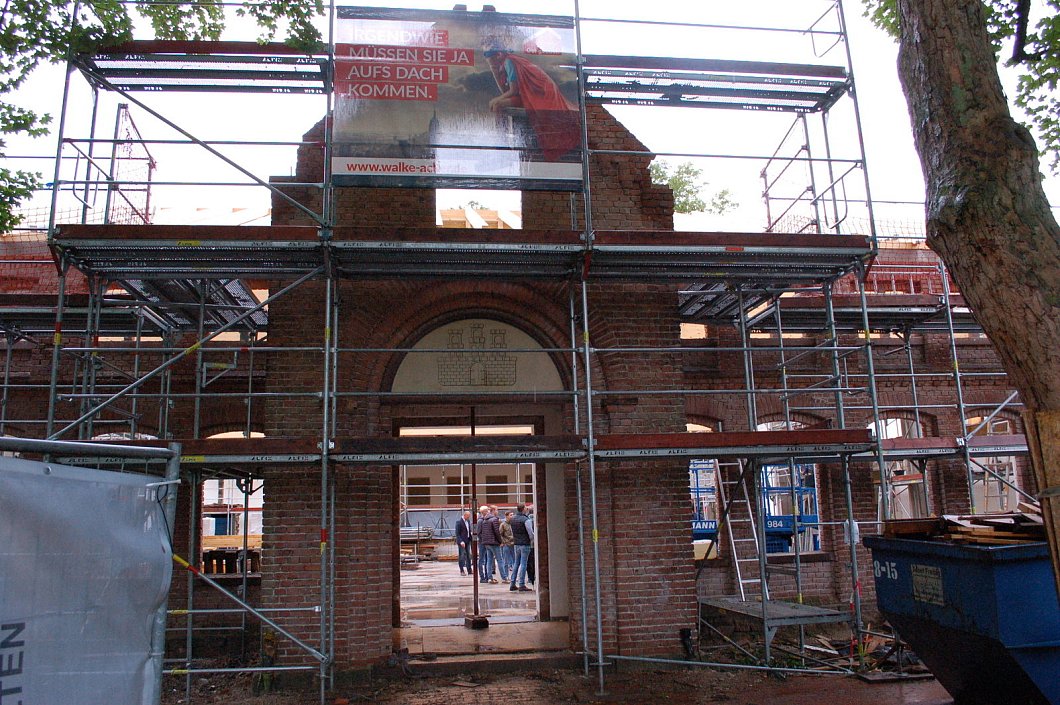 Nur die Backstein-Fassade des ehemaligen Schützenhauses aus dem Jahr 1890 und der später angebaute Bühnenbereich bleiben stehen. Ansonsten wird alles neu gebaut. Auch das Dach musste komplett neu aufgebaut werden, denn die bisherige Dachkonstruktion hätte die erforderliche Dämmung nicht tragen können. Denn das Dach soll – wie das gesamte Gebäude – modernsten energetischen Standards entsprechen. Die Sanitäranlagen werden erweitert, die gesamte Halle soll barrierefrei sein, versicherte Torke.