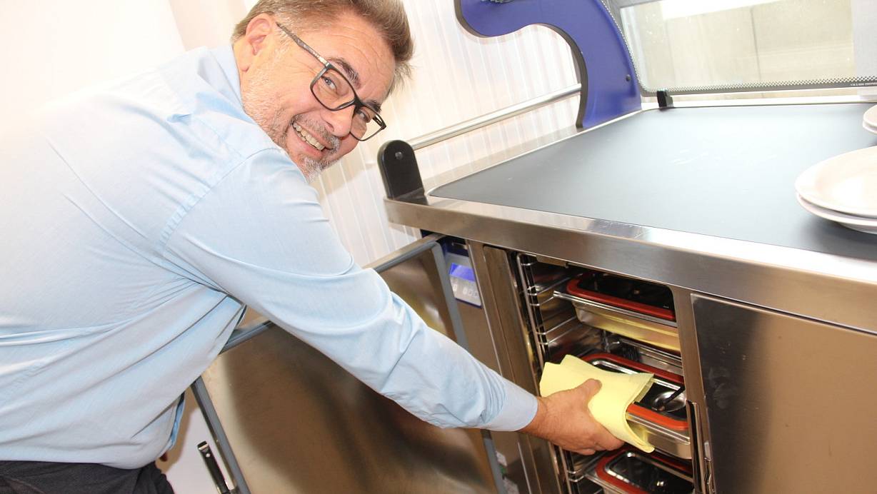 KHWE-Serviceleiter Hans-Michael Koziollek entnimmt einen Behälter mit aufgewärmtem Essen aus dem Regenerator. | © Alexander Graßhoff
