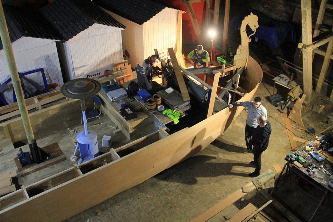 Seit Herbst werkelt das Team nun in einer Scheune auf dem Gut Menzenbrock bei Ottenhausen, wo das Schiff bei Familie Lücking seinen Heimathafen hat. Inzwischen ist das Gefährt fast fertig. In der vergangenen Woche wurde endlich der Drachen am Bug montiert. Einige Feinarbeiten, wie das Anbringen der Handläufe, sind noch nötig. Auch der Anstrich fehlt noch. Dabei wird nur Klarlack verwendet, damit die Holzplanken wie im Original gut sichtbar bleiben.