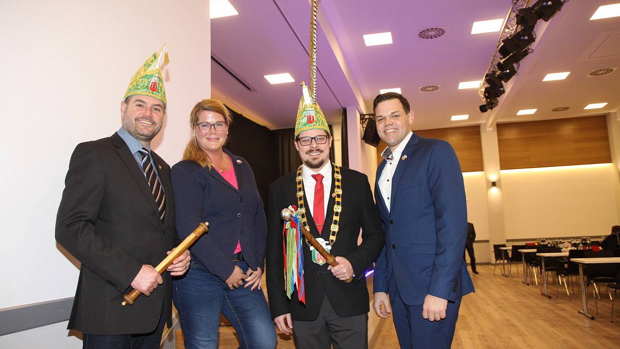 Hofmarschall Andreas Volmer (v. l.), Julia Claes von den Kumpelstilzchen, Karnevalsprinz Marc Obermann und Dominik Thiet, Präsident der Steinheimer Karnvalsgesellschaft, freuen sich auf schöne Veranstaltungen in der nun bestens ausgestatteten Steinheimer Stadthalle. | © Hermann Ludwig