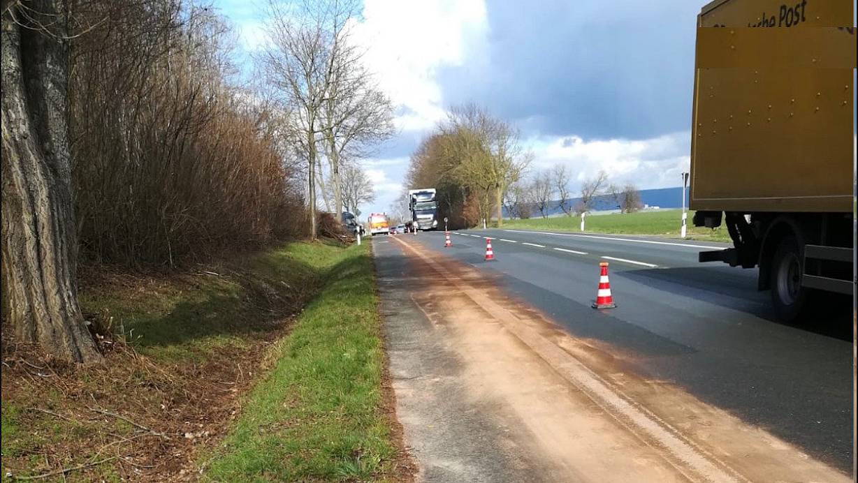 Der Verkehr auf der Ostwestfalenstraße wurde an dem ausgelaufenen Hydrauliköl vorbeigeleitet. | © Feuerwehr Steinheim