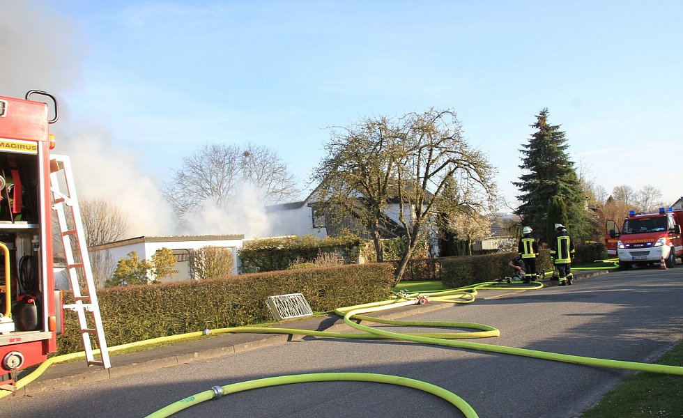 Durch eine kleinere Explosion, deren Ursache noch unklar ist, flogen Teile des Daches bis auf ein Nachbargrundstück auch Fenster eines Nachbargebäudes barsten. Nach einem ersten Löschangriff begannen die Einsatzkräfte, dass Dach der Garagenanlage einzureißen. Verletzt wurde nach erster Einschätzung der Polizei niemand. Vorsorglich wurden jedoch zwei Personen vom Rettungsdienst in ein Krankenhaus gebracht. Die Straße im Ort war während des Einsatzes, der bis zum späten Abend andauerte, gesperrt. Für die Nachlöscharbeiten wurde zusätzlich ein Bagger eingesetzt, um Gebäudeteile einzureißen.