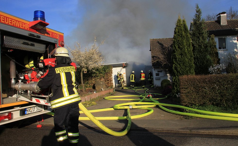 Nach ersten Informationen vor Ort griff das Feuer von einer Garage auf mehrere weitere über. Deshalb wurden alle Einheiten der Freiwilligen Feuerwehr Steinheim alarmiert und ein Schlauchwagen und der Atemschutzcontainer der Kreisfeuerwehrzentrale in Brakel angefordert. Insgesamt waren damit 97 Einsatzkräfte vor Ort. Eine Herausforderung für die Einsatzkräfte war, dass nicht genau bekannt war, was sich alles in den Garagen befindet. Brennende Reifen sorgten für eine enorme Rauchentwicklung, die weithin zu sehen war. Zudem musste das Löschwasser über eine lange Wegstrecke vom Heubach her zur Brandstelle gefördert werden.