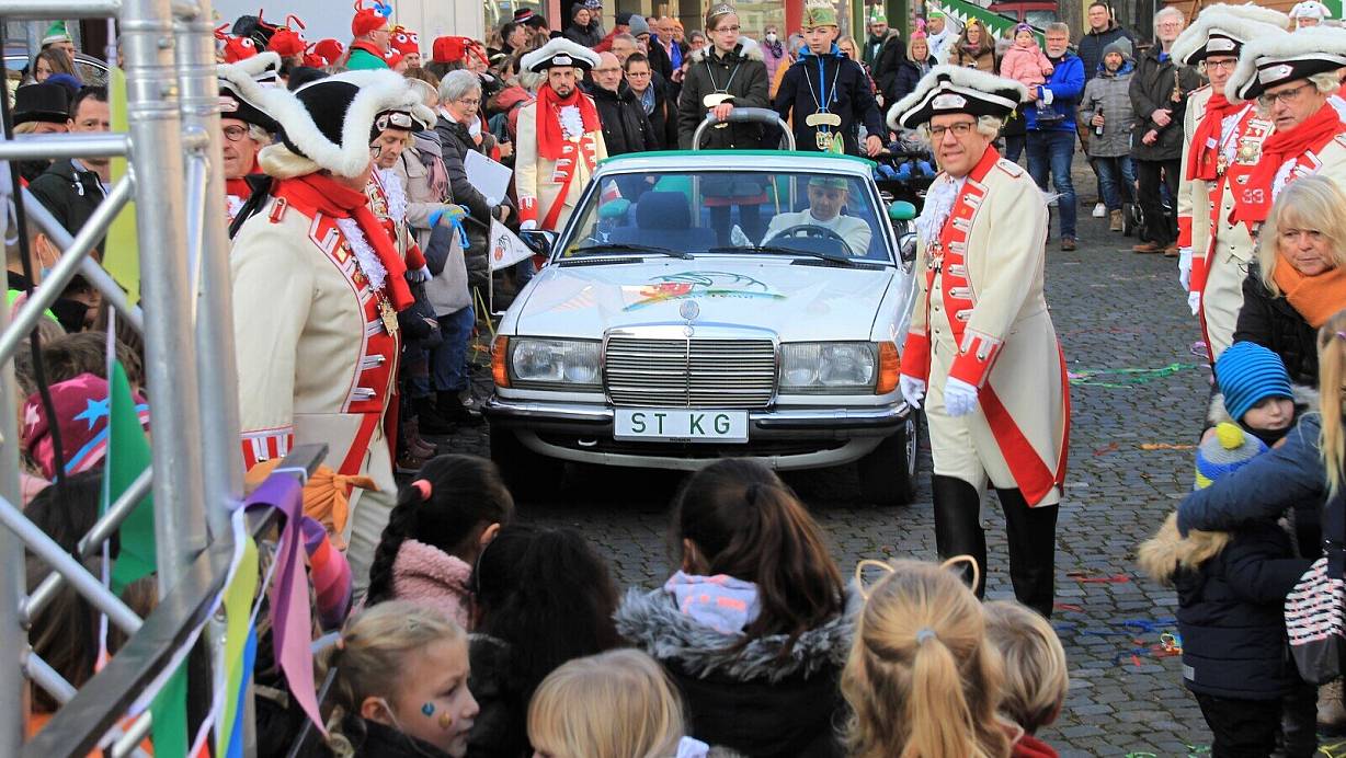 Emelie Meinersmann und Conner Kruse wurden per Auto zur Bühne auf den Marktplatz gefahren. Die Garde der StKG bahnte ihnen dabei den Weg. | © Madita Schellenberg
