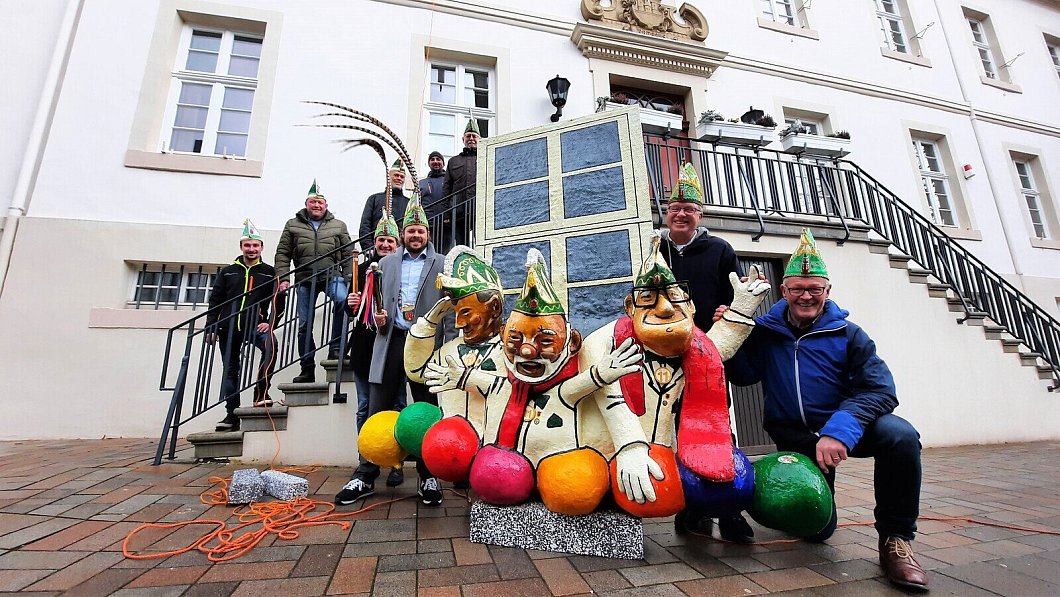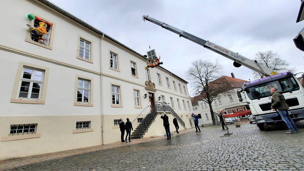 Steinheim. Kann er auf dem Marktplatz auch nicht ausgelassen gefeiert werden, so soll der Karneval in Steinheim doch trotzdem bestens sichtbar sein: Ab sofort thronen wieder die jecken StKG-Ehrenpräsidenten Meinolf Lambertz, Lothar Runte und Markus Struck über der Stadt – und ein Clown. Allesamt sind sie aus Modelliermasse gemacht und närrisch bemalt. In den kommenden Wochen grüßen sie alle jecken Passanten aus den Fenstern des Rathauses.