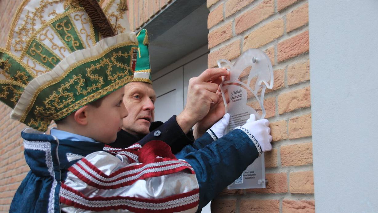 Zepter? Grundschulschlüssel? Steinheims Kinderprinz Nils Floren und seine Prinzessin Luca Weidlich halten in dieser Session auch ganz andere Utensilien in den Händen. Denn coronabedingt fällt so mancher karnevalistischer Höhepunkt zwar aus – dafür gibts absolute Neuheiten, wie die Eröffnung des jecken Themenweges. Ausgerüstet unter anderem mit einer Leiter und einem Makita-Bohrschrauber, durften die jungen Tollitäten das Schild der fünften Station des Rundgangs anbringen: an der Turnhalle der Steinheimer Grundschule.