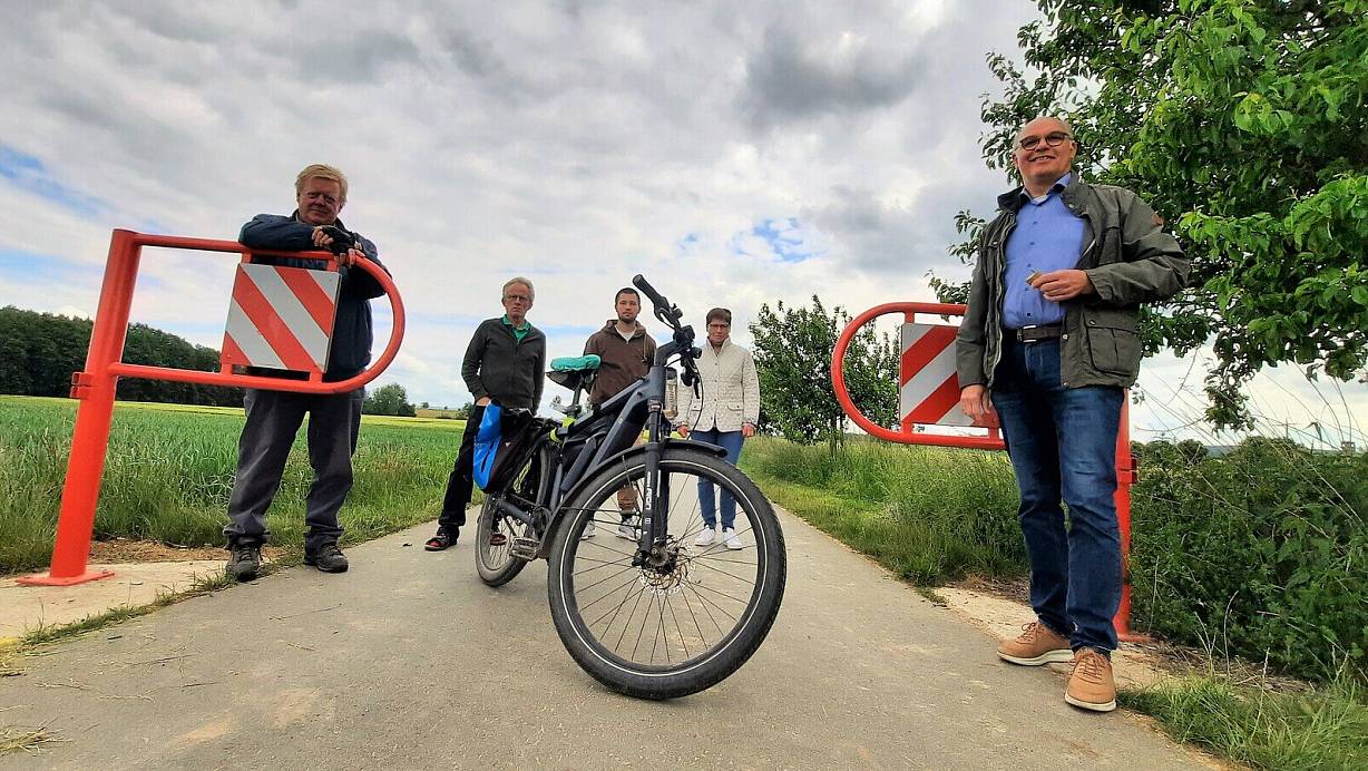 Stephan Lücking (Verein „Ländlicher Raum aktiv“, v. l.), Bernd Behling, Philipp Kochan, Therese Meier (Stadt) und Wilfried Müller (Bezirksausschussvorsitzender) reicht’s – denn andauernd verschaffen sich Unbekannte eine unerlaubte Pkw-Durchfahrt. | © Madita Schellenberg
