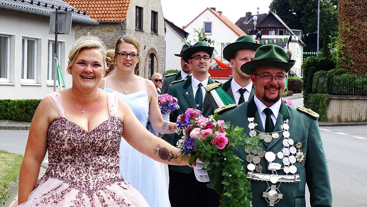Dafür feierten die Schützen nun umso schöner: "Das wird richtig geil, nach drei Jahren wird endlich wieder gefeiert", heizte Adjutant Steffen Lauer seinen grüngewandeten Genossen ein. Das ganze Dorf kam zusammen, um dem würdigen Königspaar einen fantastischen Empfang zu bereiten. Regentin Synke Lütkehaus erstrahlte dabei in einem roséfarbenen Kleid mit aufwendig besticktem Oberteil, hauchzarten Trägern und einem weiten, majestätischen Rock.
