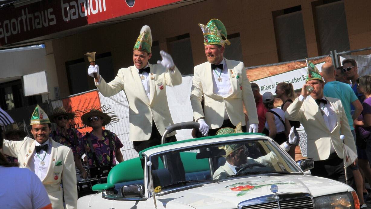 Beim großen Jubiläumsfest „111 Jahre Rosenmontagszüge in Steinheim“ feierten die Jecken im August im puren Sonnenschein – darunter auch Präsident Dominik Thiet und Vizepräsident Axel Remmert-Bobe im flotten StKG-Flitzer. | © Madita Schellenberg