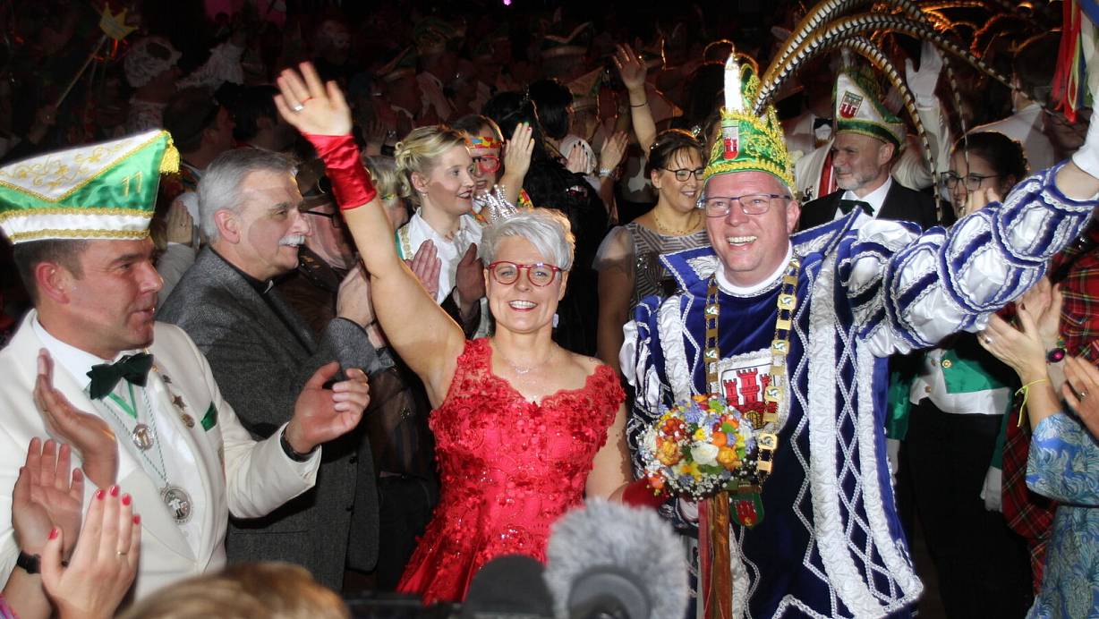 Erster Auftritt als Regentenpaar: Prinzessin Wilma Thorenmeier und Prinz Karsten Husemann auf den närrischsten 55 Metern ihres Jeckenlebens durch die Steinheimer Stadthalle. Hunderte Karnevalsfans jubeln den beiden Tollitäten und ihrem Gefolge zu. | © Madita Schellenberg