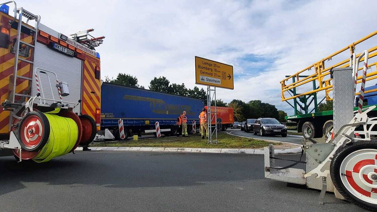 Lkw in Kreisverkehr bei Steinheim liegen geblieben
